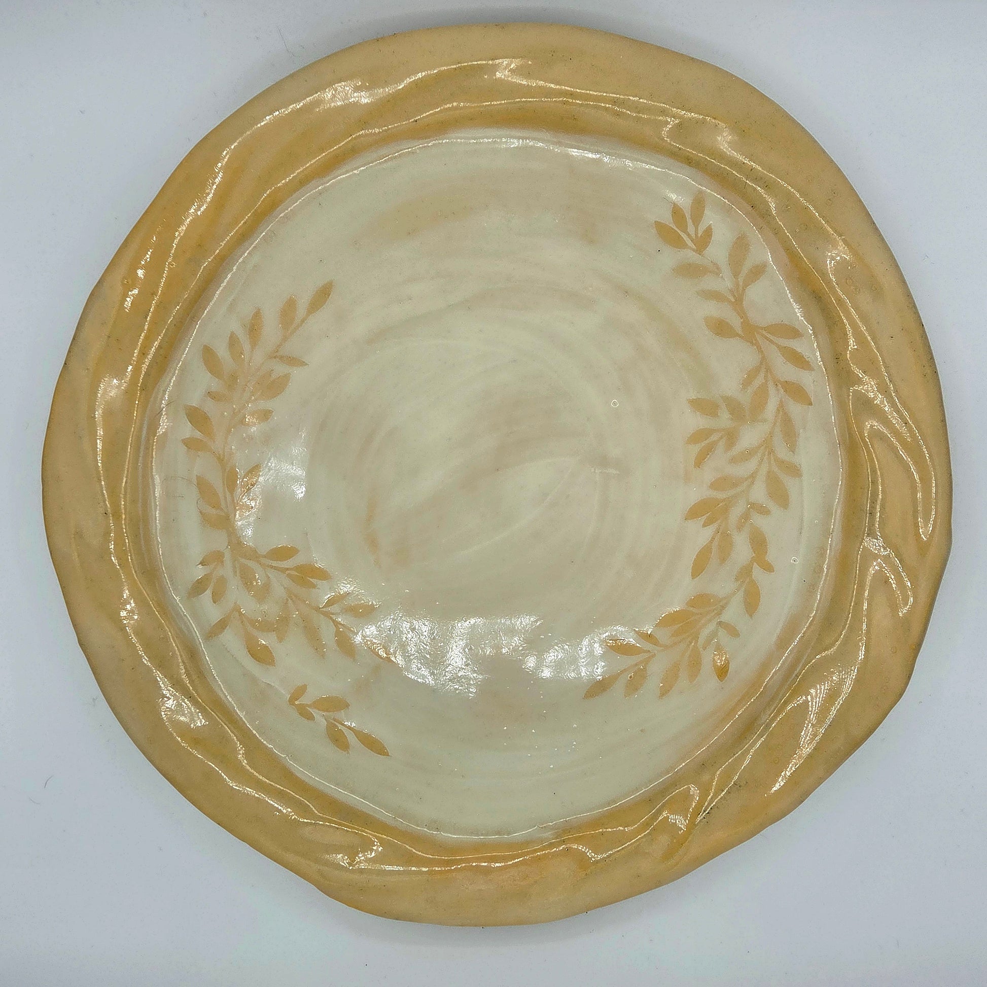 Large cream and white serving platter with leaf design. Dishwasher safe. 14 x 14 x 1.5 inches.